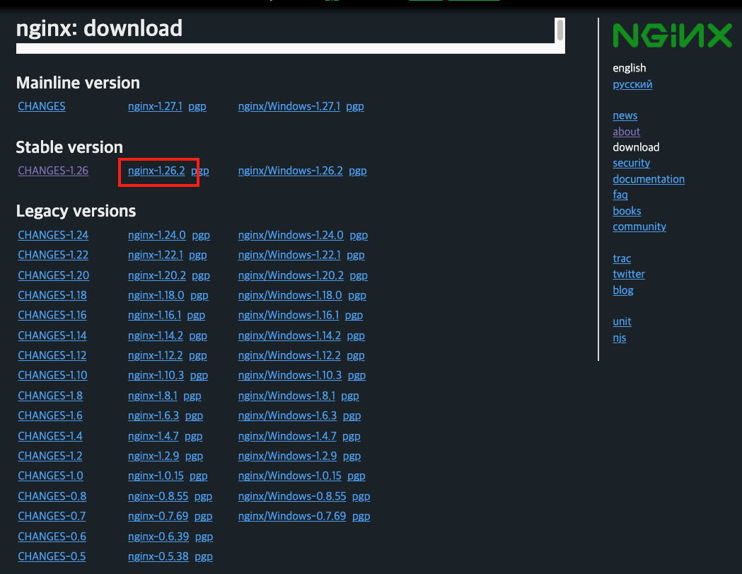 https://nginx.org/en/download.html 에서 파일을 우클릭해서 주소를 복사합니다.